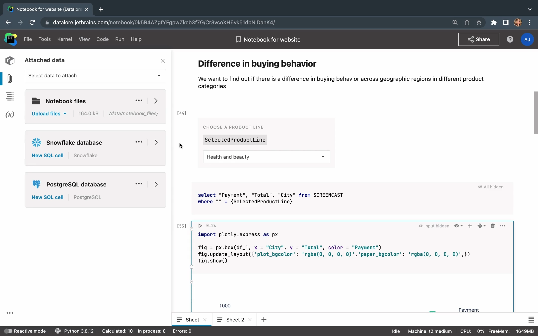 Datalore está centrado en el código y es colaborativo. Puede alojarse de forma privada en sus instalaciones o en la nube. Importar datos Conecte sus notebooks a bases de datos y al almacenamiento en la nube. Consúltelos con SQL y Python. Funcionalidades principales
