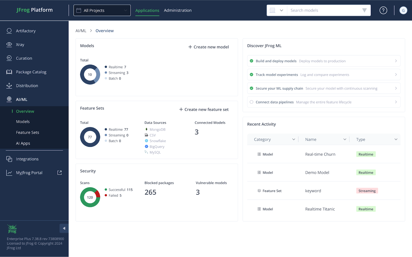 No permita que la IA sea una caja negra. JFrog ML incorpora escaneo de seguridad nativo para detectar paquetes maliciosos y vulnerabilidades en las dependencias de los modelos. Con Releases Confiables para IA, solo los modelos que cumplen con sus políticas de calidad y seguridad avanzan a producción.
