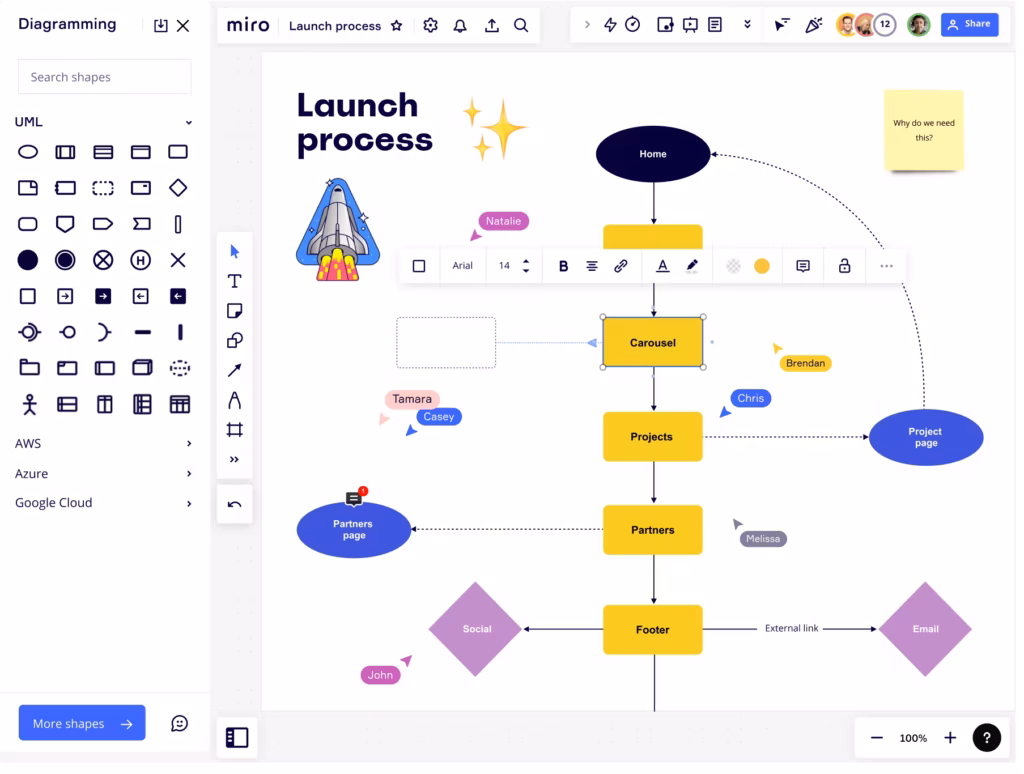 Permite que los equipos trabajen juntos en un lienzo digital infinito, agregando notas, formas, imágenes, flujos de proceso y mucho más, todo en tiempo real.